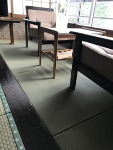 こちらは301と201の画像です。ほとんどの部屋がそうですが、市松模様の畳表に緑地に桜の縁を使っていただきました。窓際のスペースには縁なし畳を納めさせていただきました。